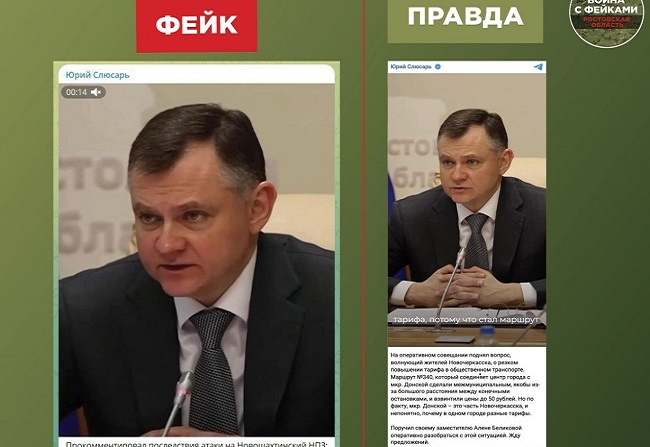 Авторы вброса взяли видео с речью главы Ростовской области от 13 января 2025 года, которое касалось тарифов на общественный транспорт, и изменили содержание его слов при помощи нейросетей. После фейковую запись разместили в телеграм-канале, который стилизован под реальный канал главы региона. Однако невооруженным взглядом можно заметить подлог — на фейковом канале всего лишь тысяча подписчиков, а на официальном канале Юрия Слюсаря — более 144 тысяч.