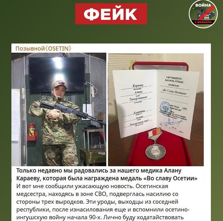 В осетинском сегменте социальных сетей распространилось ложное сообщение о том, что якобы российские военнослужащие в зоне СВО совершили преступление в отношении медсестры из Северной Осетии, сообщает ТГ-канал «Война с фейками».