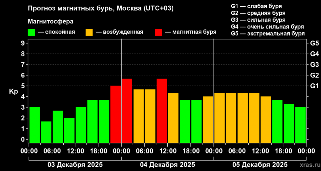 Первая магнитная буря этой зимы может проявиться уже 3 декабря. По данным Лаборатории солнечной астрономии Института космических исследований (ИКИ) РАН, ожидаемые геомагнитные возмущения не должны превысить средние значения.