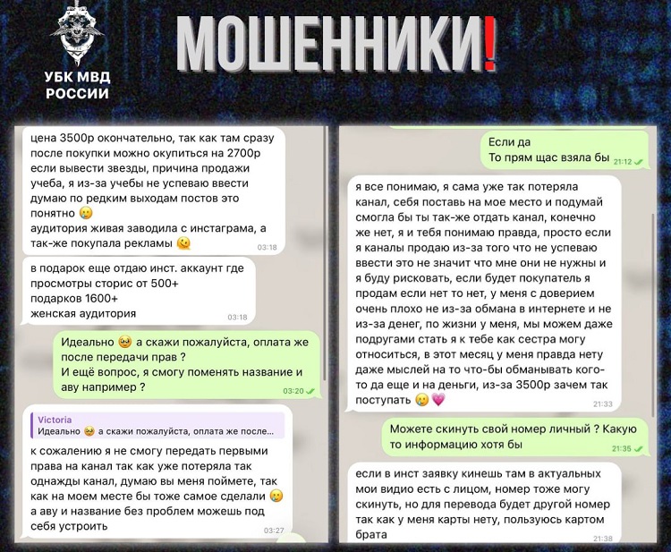 Злоумышленники предлагают приобрести якобы готовые площадки с «живыми подписчиками» и быстрой окупаемостью. При этом они настаивают на предоплате, после чего прекращают выходить на связь. В результате покупатель остаётся без денег и без доступа к каналу.