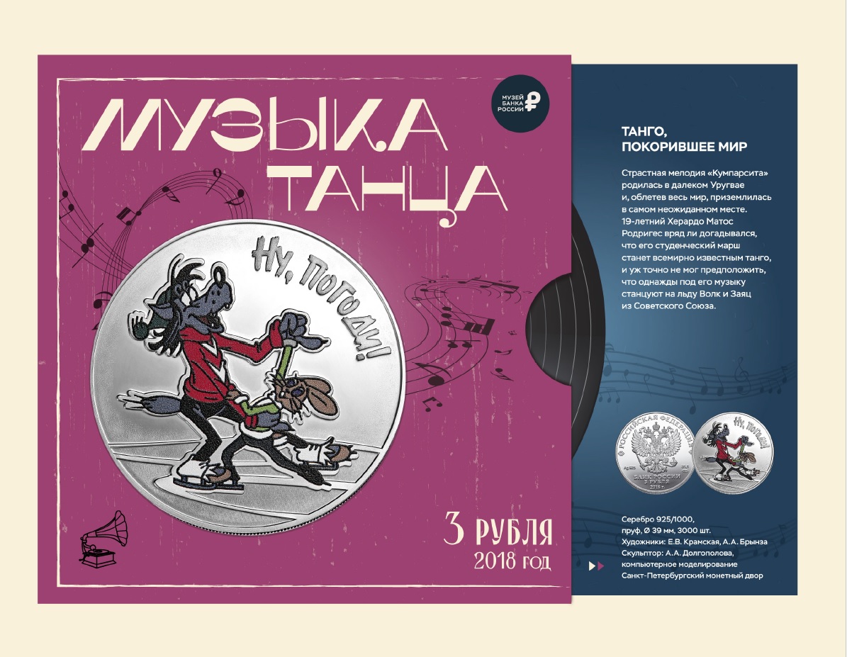 Среди экспонатов выставки — трёхрублёвая серебряная монета, на которой изображена сцена из мультфильма «Ну, погоди!», где Волк и Заяц танцуют на коньках под самое известное в мире танго «Кумпарсита».