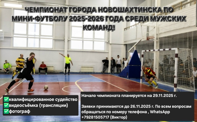 В Новошахтинске открыт приём заявок на участие в открытом чемпионате города по мини-футболу среди мужских команд сезона 2025–2026 годов.