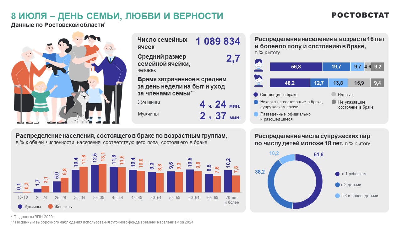 В Донском регионе насчитывается свыше 1 миллиона семей, среди которых представлены различные типы семейного устройства: супруги с детьми, пары без детей, один из родителей с детьми. Среднестатистическая семья состоит из 2–3 человек.