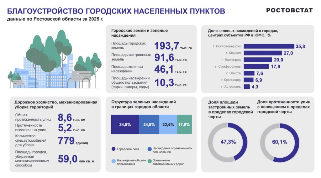 Качество городской среды и развитие общественных пространств остаются в центре внимания жителей и властей. Ростовстат подвел итоги федерального статистического наблюдения о благоустройстве городов Ростовской области по итогам 2025 года.