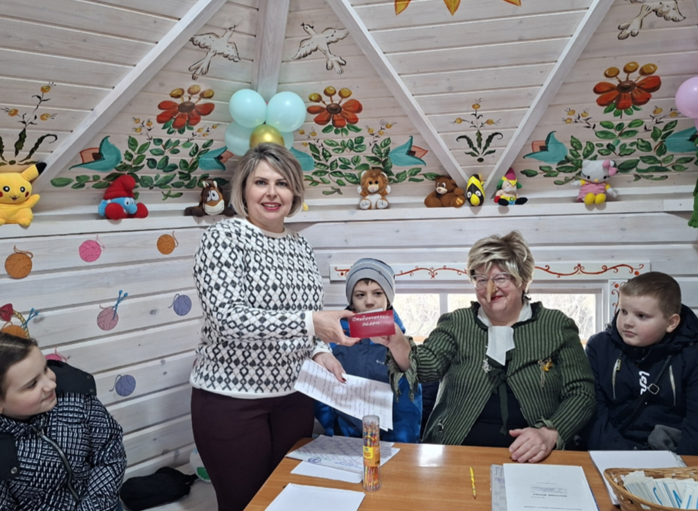 После этого заслуженный учитель школы Приболотная Я. Л. провела для детей урок русского языка. Ребята узнали интересные факты о родном языке и приняли участие в познавательном задании — из карточек с буквами они составили небольшой рассказ о жизни Ягули в парке.