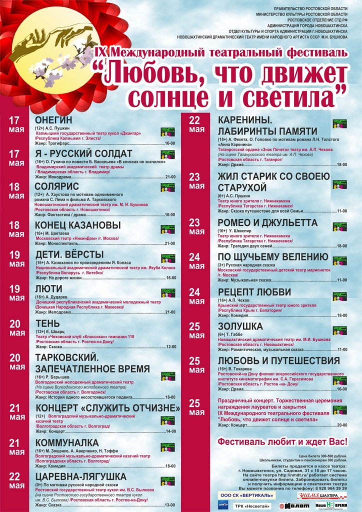 Новошахтинский драматический театр при поддержке правительства и министерства культуры Ростовской области, администрации города с 17 по 25 мая проведет IX Международный театральный фестиваль «Любовь, что движет солнце и светила».