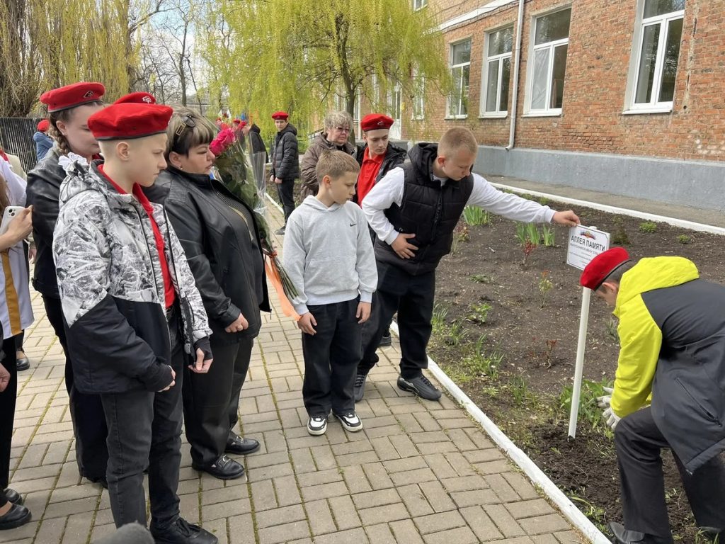 После линейки на школьной аллее высадили розы. Саженцы вместе с юнармейцами посадили матери выпускников и командир школьного отряда Владимир Маньков. Рядом появилась памятная табличка — её установили младшие братья Александра Волкова.