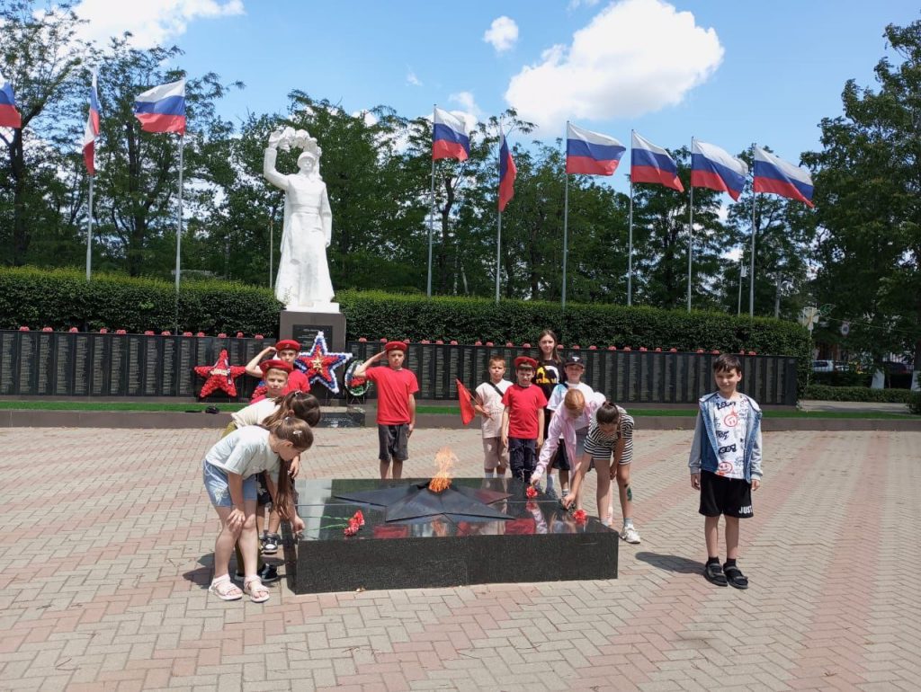 Воспитанники школьного летнего лагеря приняли участие во Всероссийской акции «Память священна», приуроченной ко Дню Памяти и Скорби — 22 июня. Они возложили цветы к Вечному огню на Аллее Славы в парке Город Детства и почтили память воинов, фамилии которых высечены на Стене ПАМЯТИ .