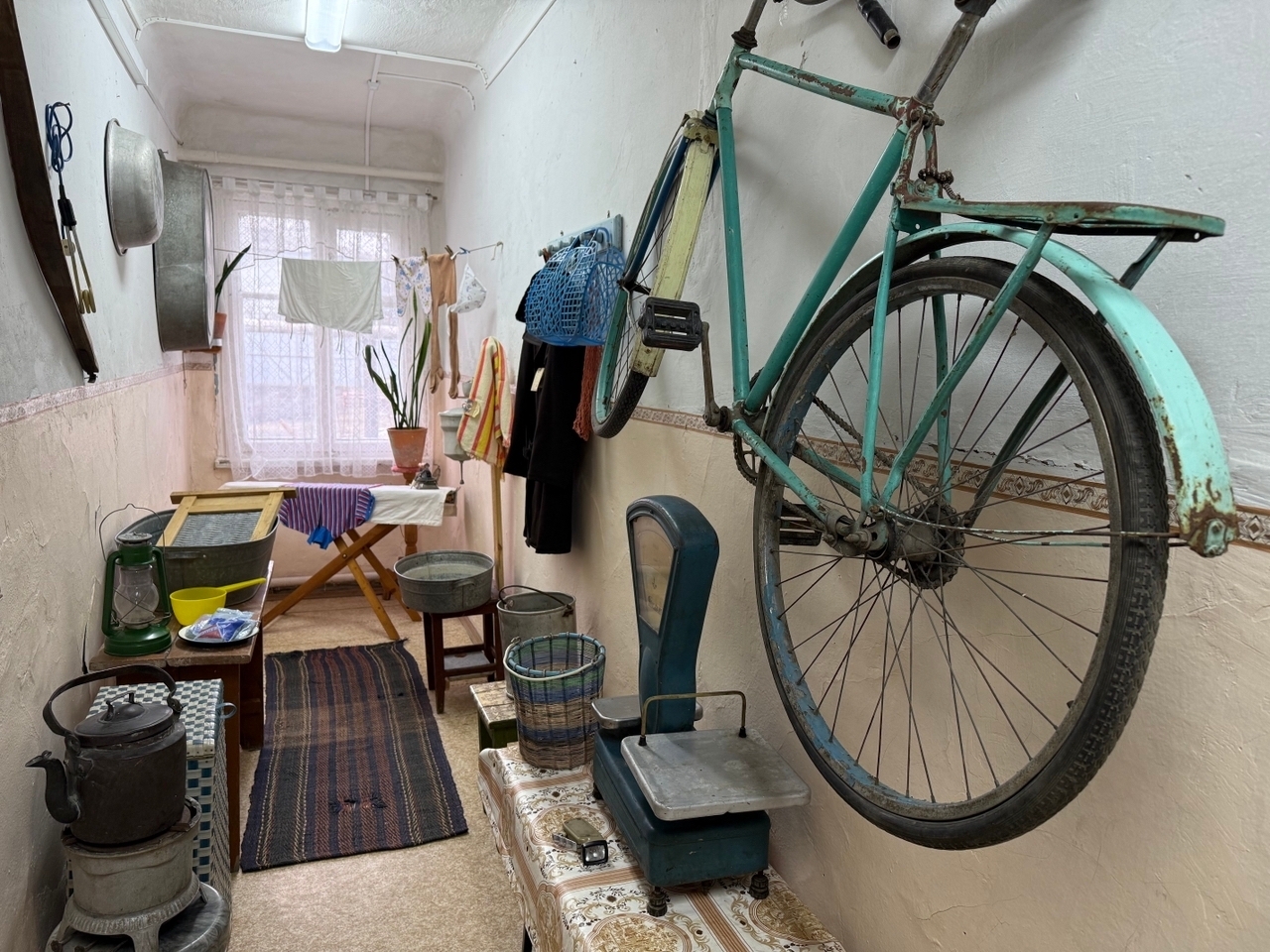 Создатели выставки воссоздали будничные, но такие знакомые многим сцены. У порога — женские резиновые сапоги и калоши, неизменные спутницы слякотной весны и осени. Рядом расположились стиральные тазы и корыта, в которых когда-то кипела работа по хозяйству. На стене — рукомойник, без которого не обходилась ни одна коммуналка. В углу пристроилась плетеная корзина для белья, а вокруг множество мелочей, которые не помещались в тесных квартирах, но были необходимы в быту.