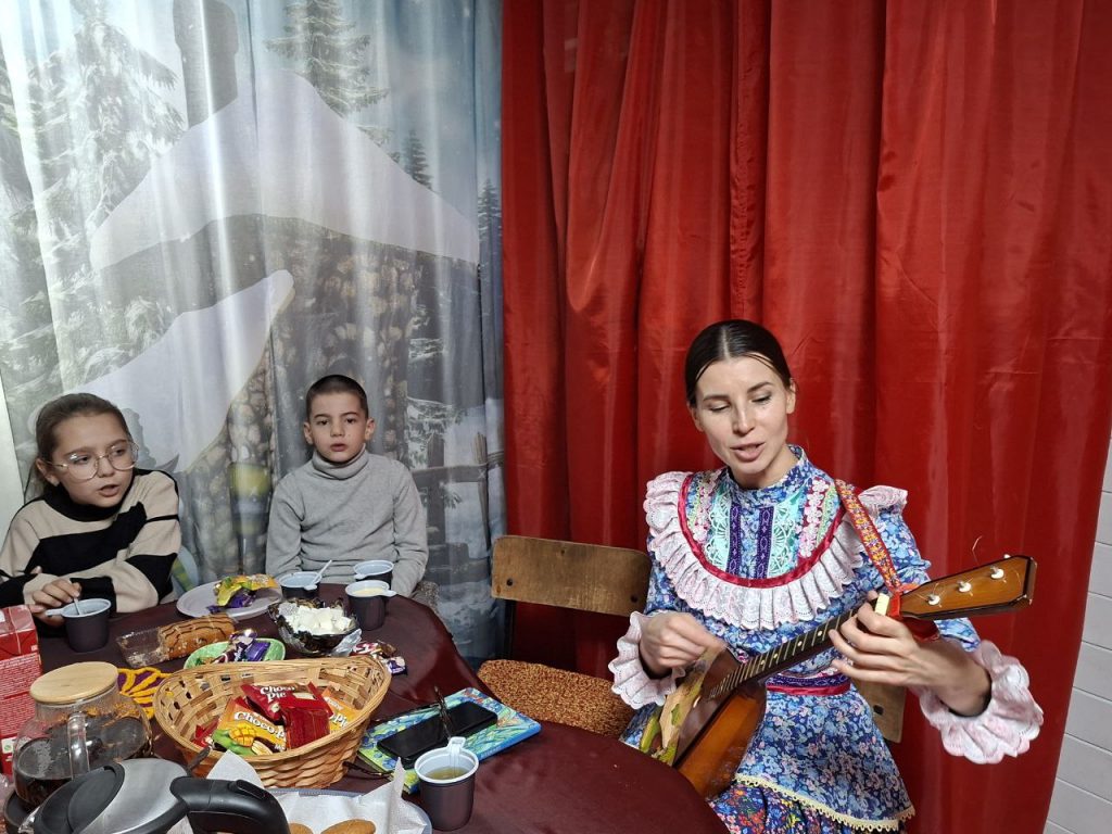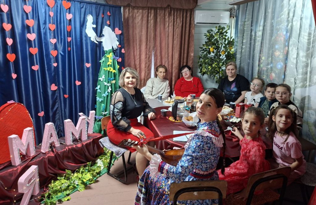 Для мам выступили юные артисты — дети исполняли частушки, читали трогательные стихи и дарили зрителям праздничное настроение. Музыкальное сопровождение, в том числе звучание балалайки, создало особую домашнюю атмосферу.