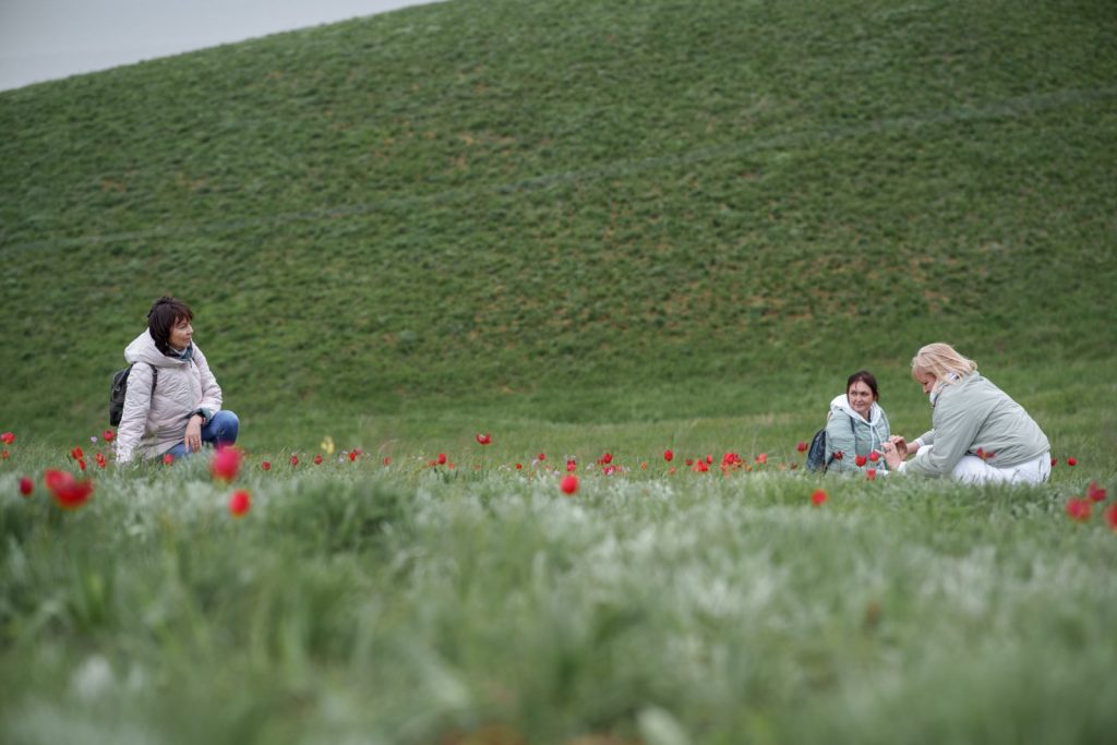 На берегу озера Лопуховатого в сопровождении инспекторов заповедника посетители любовались цветущей степью, полями тюльпана душистого, тюльпана Биберштейна, касатика низкого и других растений.