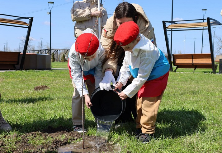 Первыми участниками акции стали представители городской власти и многодетная семья Щедриных. Вместе с главой города и председателем городской Думы Юрий Ушанев они высадили саженцы сакуры, положив начало будущему семейному саду.