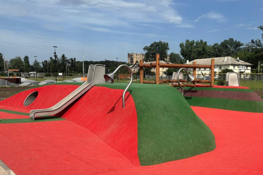 Площадка имеет свой уникальный дизайн и уже полюбилась новошахтинской детворе. На искусственных неровностях, созданных с помощью геопластика и резиновой крошки, размещены тоннели, холмы, горки и прочие сооружения с ярким и безопасным покрытием.