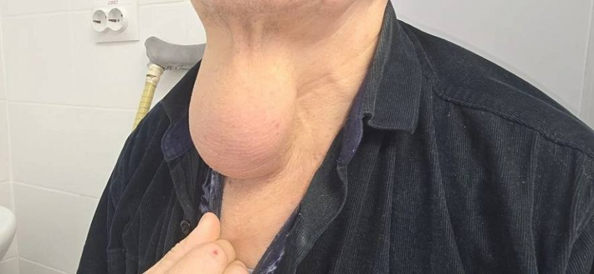 Особенностью случая стали размеры опухоли: она достигала 15 × 12 × 8 см и внешне напоминала мешок на шее. Пациент жил с новообразованием около десяти лет и обратился за медицинской помощью только тогда, когда опухоль начала мешать в повседневной жизни. После первичного обследования в поликлинике мужчину направили в стационар.