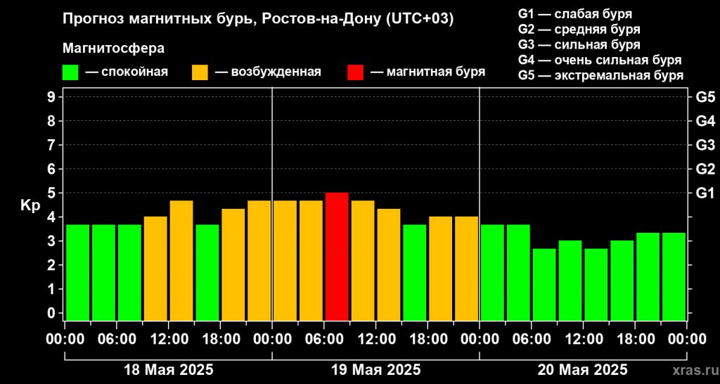 По прогнозу ученых, буря достигнет уровня G1, что соответствует слабой интенсивности. Основной пик активности прогнозируется в утренние часы — с 6:00 до 8:00. Несмотря на это, возбужденное состояние магнитосферы сохранится на протяжении всех суток.