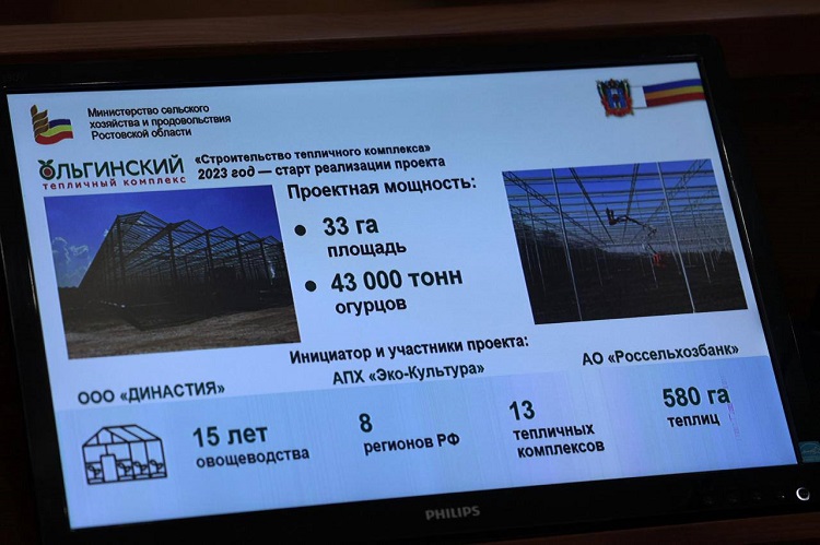Второй проект — стратегический. Речь идёт о строительстве крупнейшего в Ростовской области тепличного комплекса «Ольгинский» при участии одного из лидеров отрасли — холдинга «Эко-Культура». Комплекс площадью 33 гектара высокотехнологичных теплиц будет круглогодично производить до 43 тысяч тонн свежих огурцов в год. Инвестиции в проект составляют 22,6 млрд рублей, будет создано около 600 рабочих мест. Стройка ведётся в активной фазе и является наглядным примером реального импортозамещения и укрепления продовольственного самообеспечения региона.
