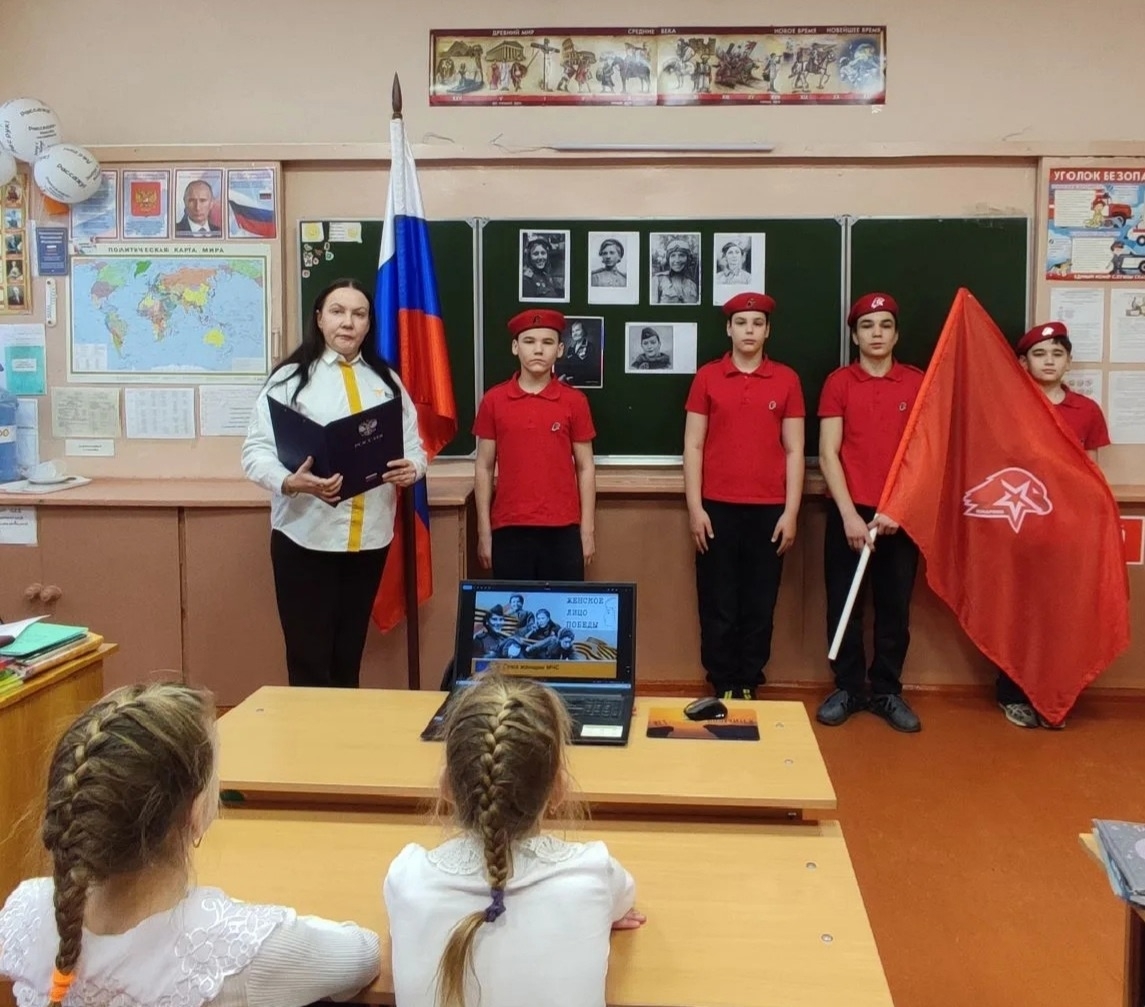 Советник директора по воспитанию Ольга Калицкая совместно с активистами юнармейского отряда «Патриот» организовали и провели тематический урок в рамках всероссийской акции, посвящённой женщинам — участницам Великой Отечественной войны.