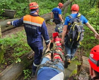 Спасатели после транспортировке на носилках по тропе ущелья передали пострадавшую врачам.