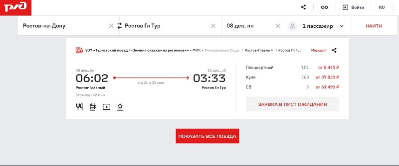 Путешествие из Ростова-на-Дону займет пять дней и пять ночей. Даты отправления из Ростова-на-Дону: 8, 16, 24 декабря и 3 января. Узнать стоимость и купить билеты можно кликнув на нужную дату на сайте РЖД, перейдя по указанной выше ссылке. Цена зависит от выбранного вагона.