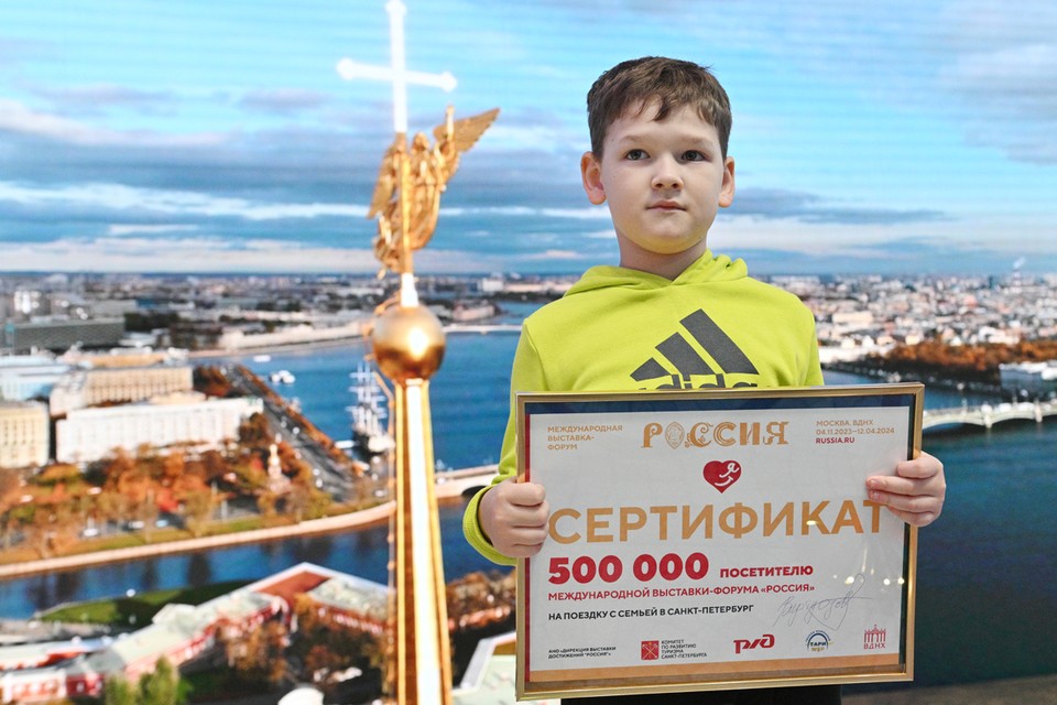 «Пятисоттысячный посетитель Международной выставки-форума «Россия» получил специальный приз — двухдневную поездку с семьей в Санкт-Петербург, — говорится в сообщении. — Победителем стал семилетний Матвей, который приехал на выставку со своей мамой из Ростова-на-Дону».